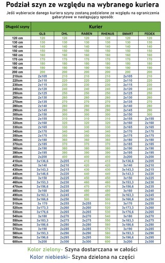 Szyny dzielone są symetrycznie ze względu na wybranego kuriera, na równe odcinki, zgodnie z tabelą zamieszczoną poniżej.