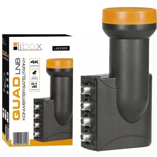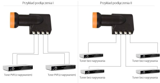 Quad- cztery konwertery single w jednej obudowie. Działa niezależnie z czterema odbiornikami satelitarnymi lub dwoma z nagrywarką.