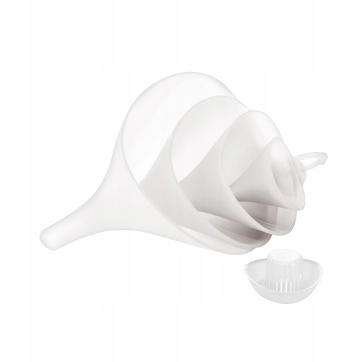- Trójkątny kształt lejków zapobiega toczeniu się ich po odłożeniu na blat kuchenny.
