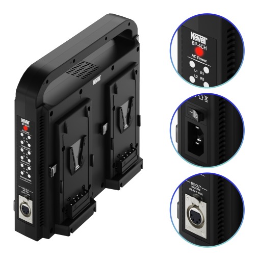 Ładowarkę Newell BP-4CH wyposażono w 4 gniazda V-mount pozwalające szybko i wygodnie naładować akumulatory. Dzięki zastosowaniu zaawansowanych kontrolerów MCU urządzenie zapewni Twoim ogniwom maksymalną żywotność. Producent zadbał również o odpowiednie systemy zabezpieczające. To dzięki nim akumulatory będą chronione przed przeładowaniem i przegraniem. Gwarantuje to nie tylko bezpieczeństwo dla Twojego sprzętu, ale również otoczenia, w którym korzystasz z ładowarki i ogniw V-mount.