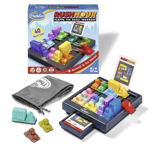 Rush Hour to gra rozwijająca zdolność sekwencyjnego myślenia. Zabawa polega na tym, by na planszy ułożyć różnokolorowe, plastikowe autka w konfigurację z jednej z 40 kart z zadaniami, a następnie poruszając się wyłącznie w pionie i poziomie – wyprowadzić z korka czerwony samochodzik.