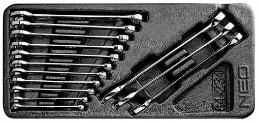 Zestaw kluczy płasko-oczkowych NEO (nr ref. 84-234) zawiera 14 kluczy w popularnych rozmiarach (od 6 do 19 mm), wykonanych zgodnie z normą DIN 3113. Wysokogatunkowa stal chromowo-wanadowa zapewnia długoletnią wytrzymałość kluczy. Narzędzia dostarczane są w praktycznej wytłoczce z tworzywa, pasującej do szuflad szafek narzędziowych NEO 84-221 i 84-222. Niezawodność produktu potwierdza 25-letnia gwarancja. Marka NEO spełnia oczekiwania profesjonalistów.
