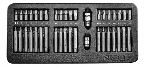 Zestaw końcówek wkrętakowych NEO (nr ref. 84-236) składa się z 40 elementów, wykonanych z wysokiej jakości stali chromowo-wanadowej. Zestaw zawiera bogaty pakiet końcówek sześciokątnych, Torx, Spline, w dwóch długościach 30 i 75 mm. Uzupełnieniem zestawu są dwie redukcje 1/2" i 3/8". Narzędzia dostarczane są w praktycznej wytłoczce z tworzywa, pasującej do szuflad szafek narzędziowych NEO 84-221 i 84-222. 25-letnia gwarancja producenta potwierdza wysoką jakość narzędzi. Marka NEO spełnia oczekiwania profesjonalistów.
