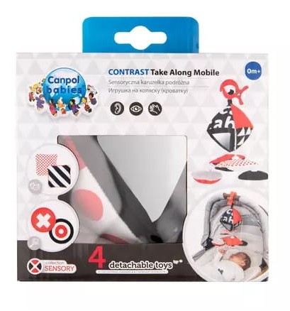 Kontrastowa karuzelka podróżna z kolekcji SENSORY TOYS kryje wiele niespodzianek, które zajmą dziecko na długi czas. Wspiera rozwój maluszka już od pierwszych dni. Stymuluje wzrok dzięki czerwieni i czerni, kolorom które niemowlę widzi jako pierwsze. Karuzelka doskonale stymuluje też rozwój koordynacji wzrokowo-słuchowej i motorycznej dziecka.