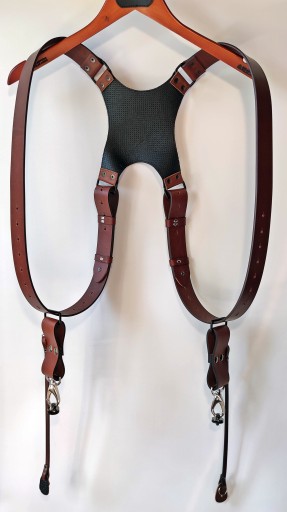 Kolor szelek taki jak na zdjęciach(proszę nie sugerowac się opisem że są czarne). Szelki wykonane ze skóry naturalnej najwyższej jakości z dbałością o najdrobniejszy detal. Krzyżak na plecy dodatkowo od strony wewnętrznej jest podszyty miękką skórą perforowaną. Szelki mają bardzo dużą skalę regulacji, także po odpowiednim ustawieniu będą pasować na każdego. Aparat mocowany jest do szelek poprzez uniwersalną śrubę fotograficzną 1/4'' osadzoną na metalowym karabińczyku z krętlikiem. Paski asekuracyjne są wykonane także ze skóry naturalnej co, gwarantuje bardzo dobrą ochronę sprzętu jak i dopełnienie wizerunku estetycznego szelek. Całość zamocowana jest na szelkach z wykorzystaniem ramki rymarskiej o grubości 3 mm i paska wykonanego z tej samej skóry, z której zostały wykonane szelki. Szerokość szelek - 4 cm a grubość skóry - 3-4 mm. Szelki wykonujemy samodzielnie w małym zakładzie kaletniczym dlatego czas oczekiwania to ok. 3 dni roboczych.