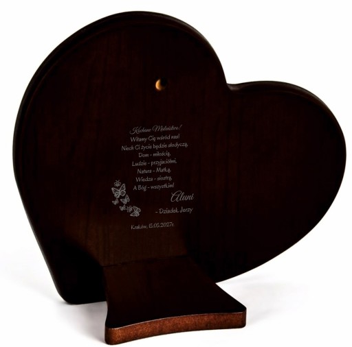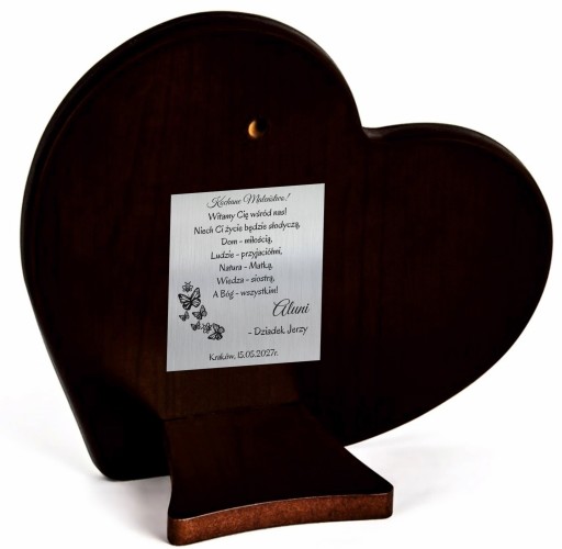 Dedykację docelowo grawerujemy na tabliczce ze srebrnego laminatu. Na życzenie możemy wygrawerować ją na złotym laminacie grawerskim lub bezpośrednio na drewnie. Szczególnie polecamy wybór graweru na drewnie z uwagi na jego szlachetny i oryginalny wygląd.