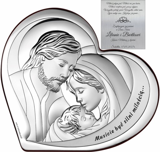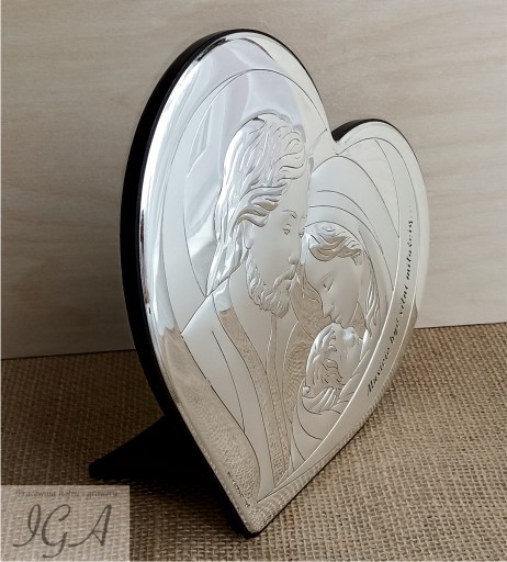 Srebrny obrazek przedstawiający wizerunek Świętej Rodziny. Doskonały prezent z okazji urodzin, na Chrzest, dla Pary Młodej z okazji Ślubu, na Rocznicę Ślubu lub jako pamiątka czy dekoracja.
