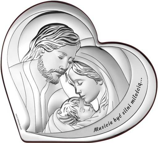 Włoski obrazek srebrny Świętej Rodziny w sercu z podpisem "Musicie być silni miłością..."