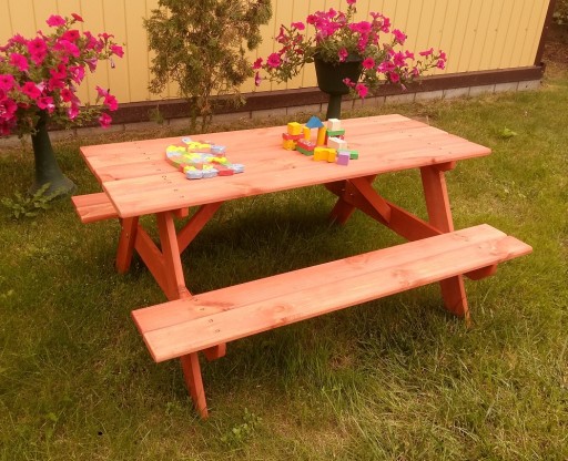 Stolik z ławeczkami wykonany solidnie i starannie z drewna sosnowego, wszystkie elementy wyszlifowane bez ostrych kantów i krawędzi, śruby i wkręty ocynkowane, drewno dobrej jakości.