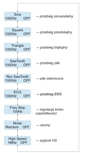 ► możliwa regulacja częstotliwości wyjściowej ze skokiem: 1, 10, 100, 1000, 10000Hz