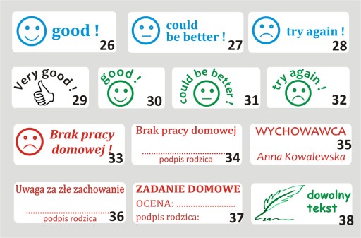 na komplet składa się 6 sztuk pieczątek dla nauczyciela o dowolnych numerach obrazków lub własnej treści
