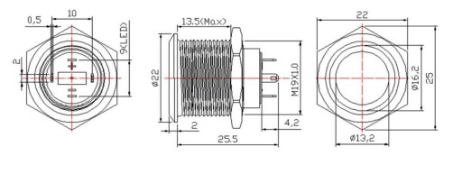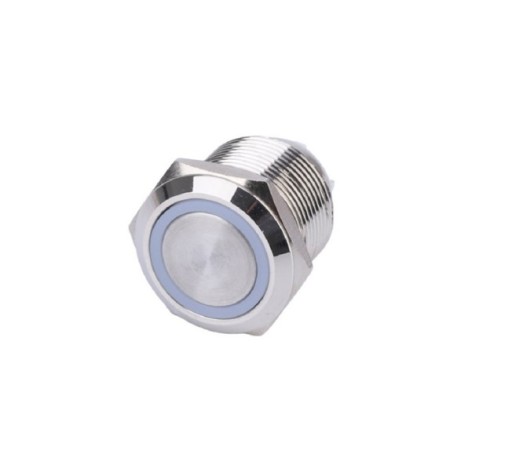 Wandaloodporny metalowy przycisk z podświetleniem pierścieniowym. Średnica otworu montażowego 19 mm.