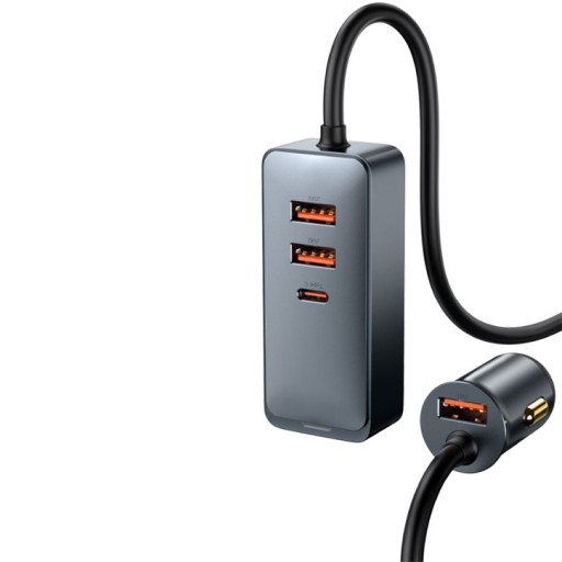 Ładowarkę samochodową Baseus Share Together wyróżnia rozgałęziacz z 1,5 metrowym kablem, dzięki któremu możesz ładować aż 3 urządzenia (4 wyjście umieszczone jest na ładowarce samochodowej) z tylnego siedzenia samochodu. Dodatkowo rozdzielacz posiada klamrę, dzięki której wygodnie możesz powiesić urządzenie tak by nie przeszkadzało w użytkowaniu.