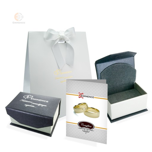 Obrączki srebrne jak i złote opakowane są w stylowe i gustowne opakowanie. Całość zapakowana jest w białą błyszczącą torebeczkę przewiązaną delikatną wstążką. Obrączki zaopatrzone są w stosowny certyfikat zawierający dane produktu, tj. numer seryjny, model, wagę, rozmiary i specyfikacje kamieni szlachetnych. Dołączona jest również instrukcja obsługi wskazująca jak długo utrzymać blask obrączek.