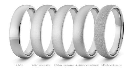W obrączkach firmy Eminence oferujemy kilka wariantów wykończenia powierzchni. W niemalże każdym wzorze można dowolnie zestawiać wykończenia według schematu zamieszczonego poniżej. Niestety ze względu na technologie w niektórych wzorach nie ma możliwości zmiany powierzchni wykończeniowej.