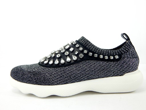 Buty wykonane z tkaniny srebrno czarnej.Ozdabiane cyrkoniami.