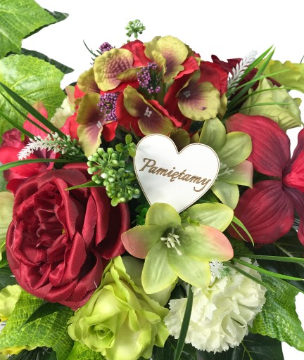 Kompozycja kwiatowa została wykonana z najwyższej jakości kwiatów sztucznych i dodatków. Do stworzenia dekoracji zostały wykorzystane angielskie róże, mieczyki, hortensja, kwiat magnolii, małe lilie, goździki, duża ilość zielonych liści oraz dodatków, idealnie wypełniająca puste przestrzenie.