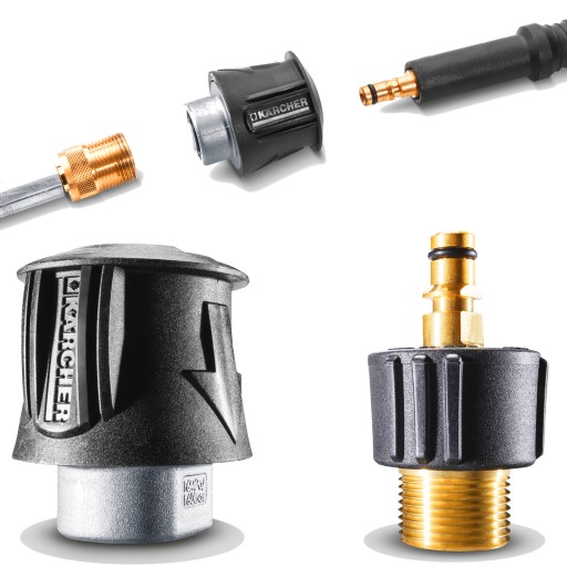 KARCHER stworzył adaptery służące do tego, byś mógł podłączyć węża ze śrubowym gwintem, do urządzenia z wysokim ciśnieniem, dzięki innowacji - Quick Connect. Adaptery wykonane są z mosiądzu oraz tworzywa sztucznego. Są łatwe w użyciu.