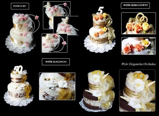 Piękny i oryginalny prezent na ślub i rocznicę ślubu - praktyczny i elegancki komplet 2 DUŻYCH ręczników kąpielowych w kształcie tortu z bogatą dekoracją kwiatową.