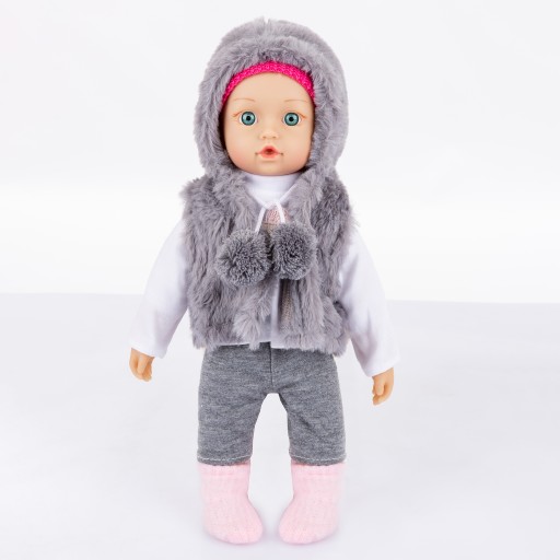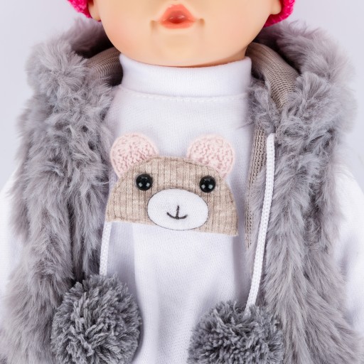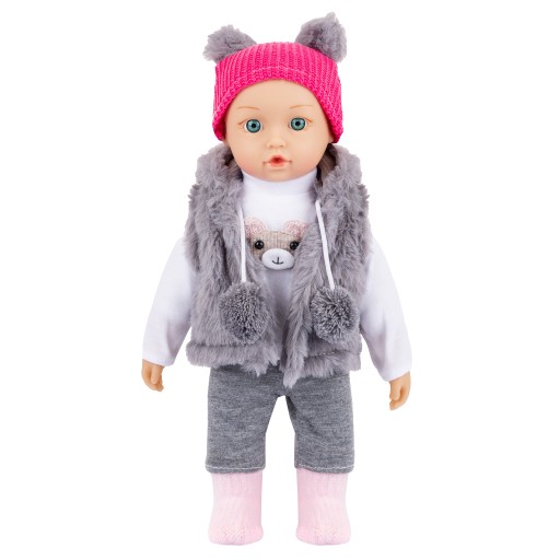 W zestawie: czapeczka, bezrękawnik, bluzka, spodnie, skarpetki. Ubranko z łatwością można zdjąć i wyprać, dzięki czemu laleczkę łatwo utrzymać w czystości.