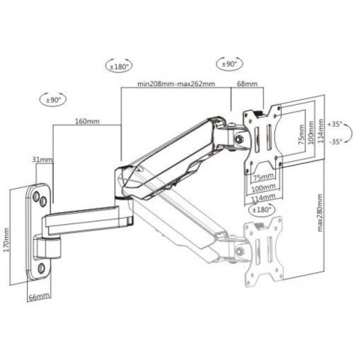 Techly ICA-LCD G112. Odpowiedni dla: TV, Maksymalna waga: 8 kg, Kompatybilny z minimalnym rozmiarem ekranu: 43,2 cm (17"), Kompatybilny z maksymalnym rozmiarem ekranu: 81,3 cm (32"), Minimalny uchwyt VESA: 75 x 75 mm, Maksymalny uchwyt VESA: 100 x 100 mm. Zakres kąta nachylenia: 35 - -35°, Obracany: 90 - -90°, Kąt obrotu: 360°, Dystans do ściany (max.): 41 cm. Kolor produktu: Czarny