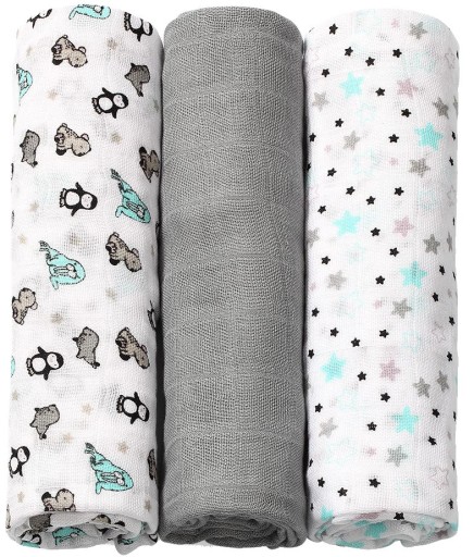 Pieluszki z włókien bambusa mogą być stosowane już od pierwszych dni życia dziecka – jako otulacz, lekki kocyk, podkład do przewijania, prześcieradło czy podręczny ręcznik. Świetnie sprawdzają się jako okrycie podczas karmienia piersią czy podkład na ramię rodzica chroniący ubranie przed ulewaniem. Mogą też służyć jako przytulanka do snu albo lekka osłona do wózka. Sprawdzą się w każdej sytuacji wymagającej bliskości ze skórą maleństwa. Zestaw zawiera 3 sztuki pieluszek: 2 z nich są zdobione kolorowymi nadrukami, trzecia jest barwiona jednolicie. Pakowane są w transparentną torbę zapinaną na napy.