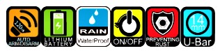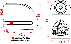 Blokada tarczy hamulcowej z wbudowanych alarmem o natężeniu dźwięku 120 dB z możliwością ustawiania opcji syreny ON/OFF. Zamek ze stali nierdzewnej i wodoodporne podzespoły elektryczne gwarantują ochronę przed korozją i niezawodność w każdych warunkach atmosferycznych. Blokada wyposażona jest w długo pracującą i przyjazną dla środowiska litową baterię. Zabezpieczenie blokuje koło bolcem o średnicy 6 mm, przez co uniemożliwia jazdę i ruch motocykla lub skutera.