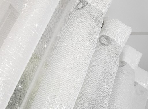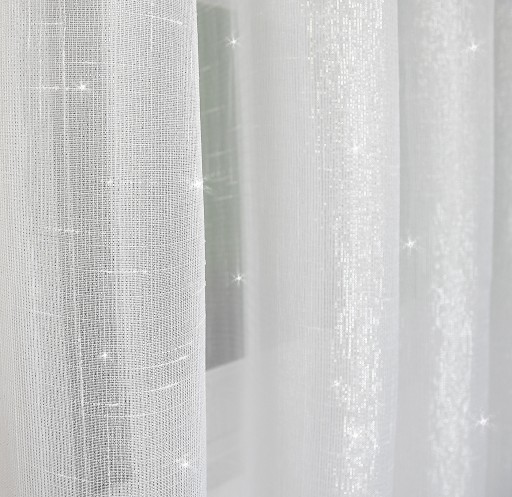 Uszyta, gotowa do powieszenia firana na przelotkach z delikatnego, śnieżnobiałego BATYSTU, przeplatana srebrną nicią