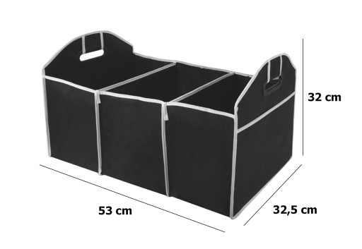Torba podzielona na części, zapewnia organizację w bagażniku. Wyposażona w uchwyty do przenoszenia.