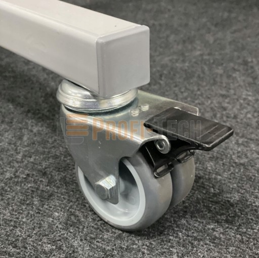 Stoły i stojaki wykonane są z profili stalowych, które zostały trwale zabezpieczone za pomocą lakierowania proszkowego, ostre krawędzie profili wypełnione są zatyczkami PVC.