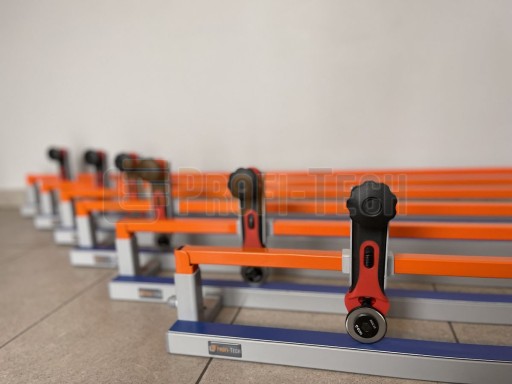 Stoły i stojaki wykonane są z profili stalowych, które zostały trwale zabezpieczone za pomocą lakierowania proszkowego, ostre krawędzie profili wypełnione są zatyczkami PVC.