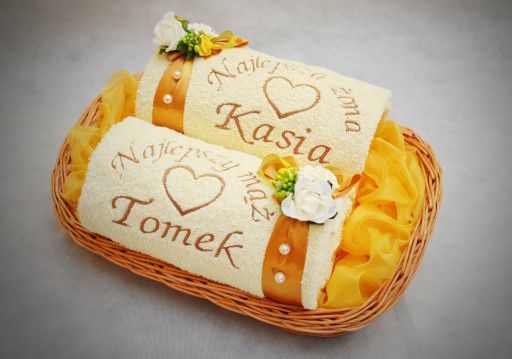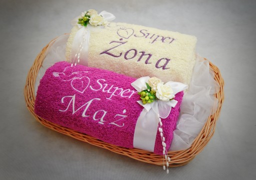 Zapraszamy do zakupu pięknie dekorowanego kosza wiklinowego, w skład którego wchodzi komplet 2 grubych, kąpielowych ręczników z Twoimi indywidualnymi haftami.
