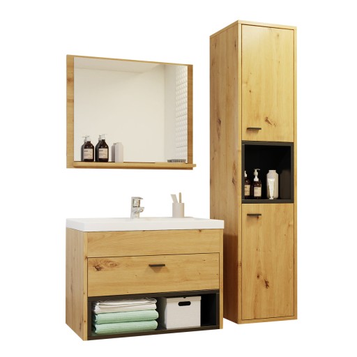 Komplet składa się z trzech elementów wiszących. Wysoki słupek z półką otwartą oraz zamkniętymi za drzwiczkami, szafka pod umywalkę z pojemną szufladą, lustro z małą półką na drobne kosmetyki.