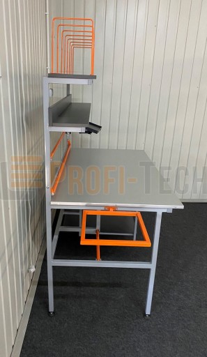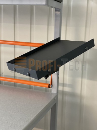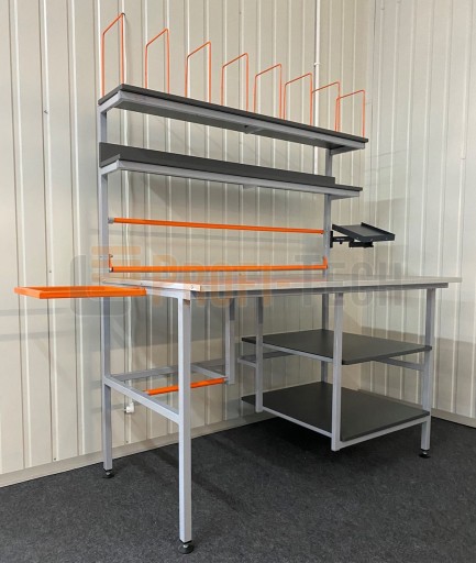 uchwyt na drukarkę do etykiet, uchwyt do worków na odpady, półki boczne, moduł oświetlenia, moduł cięcia folii, zmiana materiału blatu roboczego.