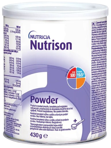 - Nutrison Powder to dietetyczny środek spożywczy specjalnego przeznaczenia medycznego. Dieta kompletna pod względem odżywczym, bezresztkowa, przeznaczona do podawania doustnego lub przez zgłębnik. Produkt bezglutenowy, nie zawiera laktozy. Może być stosowany u pacjentów u których wykorzystanie pokarmu naturalnego jest niemożliwe ale pacjenci mają zachowaną zdolność trawienia i wchłaniania.