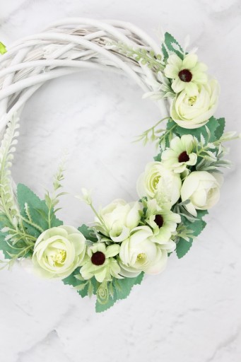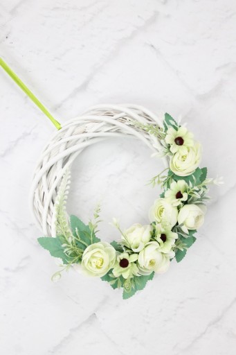 Wianek wiklinowy wybielany o średnicy 25cm udekorowany kwiatami i pąkami peoni i rumianku w odcieniach zieleni.