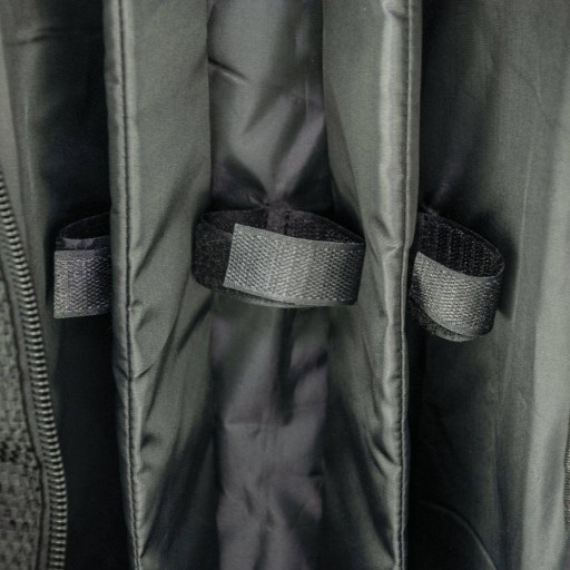 Dzięki specjalnie zaprojektowanej wewnętrznej przegrodzie pokrowiec mieści 3 uzbrojone wędki z kołowrotkami, zachowując szerokość standardowego pokrowca na 2 wędki. Wewnętrzne piankowe przegrody oraz rzepy chronią nie tylko wędki i kołowrotki, ale i żyłkę oraz zestaw ze spławikiem lub koszyczkiem zanętowym. Pokrowiec dodatkowo posiada dwie zewnętrzne komory na akcesoria. Twarde, łatwe do wyczyszczenia dno chroni przed wilgocią, gdy stawiasz pokrowiec pionowo.