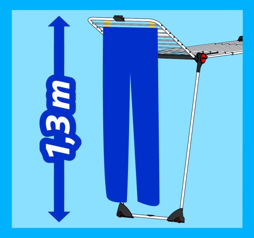 Teleskopowe linki są regulowane do 2 metrów długości co daje aż 30 metrów powierzchni suszenia. W zależności od potrzeb, po pełnym rozłożeniu może zmieścić nawet do czterech prań.