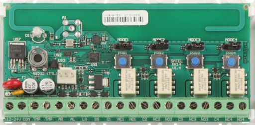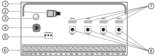 8. przyciski PRG. Umożliwiają dodawanie / usuwanie pilotów i określenie czasu pracy wyjść przekaźnikowych. Cyfra to numer wyjścia przekaźnikowego. Przycisk PRG1 umożliwia przywrócenie ustawień fabrycznych.