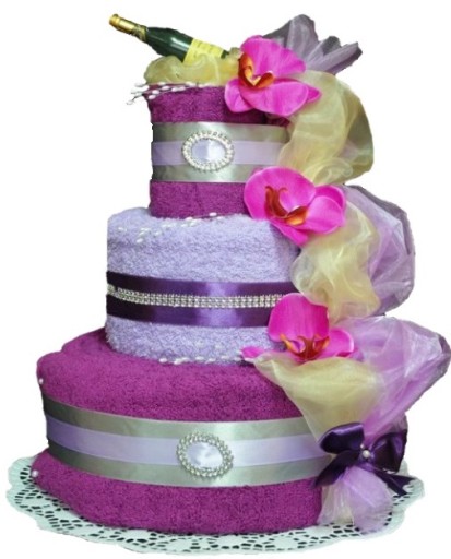 Zapraszamy do zakupu oryginalnego i eleganckiego prezentu jakim jest tort z ręczników. To doskonały prezent na ślub, rocznicę ślubu, urodziny, podziękowania dla rodziców. Doskonały, jako dodatek do "koperty" i prezent zamiast kwiatów. Tort z ręczników jest tak piękny jak bukiet, ale będzie cieszył oko dłużej. To bardzo ładny i równocześnie praktyczny prezent. Po jego rozwinięciu obdarowani będą się cieszyć miękkimi, grubymi i chłonnymi ręcznikami.