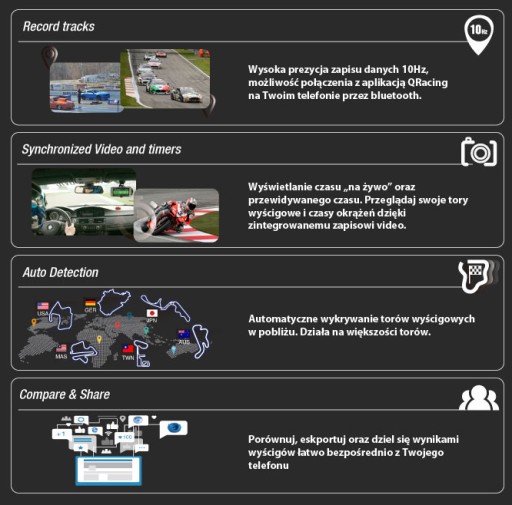- analiza wyścigu, porównania i wideo z nakładką danych w telefonie za pośrednictwem aplikacji QRacing na iOS/Android