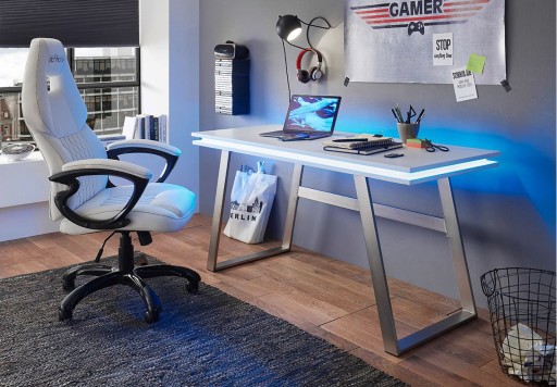Biurko lakierowane z wszechstronnym oświetleniem LED RGB pomiędzy blatami ze złączem USB. Blat wykonany z płyty MDF lakierowanej na biały mat. Całość uzupełniają nogi w optyce stali szlachetnej nierdzewnej. Dodatkowym atutem mebla jest otwór na kable w blacie, który jest bardzo praktyczny w utrzymaniu porządku. Biurko przypadnie do gustu fanom nowoczesnego stylu. Świetnie sprawdzi się zarówno w nowoczesnym biurze, jak i w pokoju nastolatka.