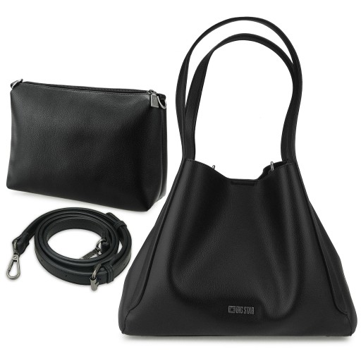 Zestaw torebek marki BIG STAR. Większa torebka po złączeniu rączki może mieć kształt typu "kuferek" lub po ich rozłączeniu przybrać klasyczny wygląd. Mniejsza torebka posiada wewnątrz 2 kieszenie i może być noszona wewnątrz większej torebki lub osobno, gdyż posiada uchwyty na pasek.