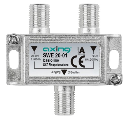 Zwrotnica (sumator) sygnału satelitarnego i telewizji naziemnej DVB-T AXING SWE 20-01. Urządzenie przeznaczone do montażu wewnątrz jak i na zewnątrz budynku (instalacja masztowa z obudową - dostępne w ofercie naszego sklepu). Sumuje częstotliwości 950-2400 MHz (satelitarna) z częstotliwościami 5-862 MHz (TV naziemna i radiowa).