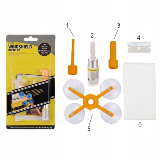 W skład zestawu wchodzi pojemnik z klejem, aplikator z przyssawkami, żyletka służąca do usuwania nadmiaru kleju, oraz folie zabezpieczające klej przed rozlaniem się. Szpary i rysy powstałe w wyniku pęknięć stają się prawie niewidoczne, a najważniejsza zaleta kleju to zatrzymanie dalszego pękania szyb przednich. Komplet nadaje się do wielorazowego użytku.