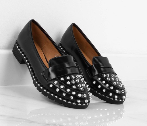 Wyjątkowe mokasyny ze skóry ekologicznej na profilowanej, płaskiej podeszwie. Piękna, głęboka czerń kolor oraz efektowne ozdoby w postaci ćwieków. Model solidnie i starannie wykonany. Obuwie idealne do tworzenia najmodniejszych stylizacji!