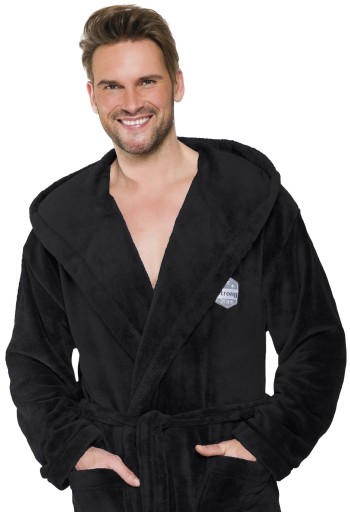 Szlafrok męski z kapturem, wiązany w pasie, z miękkiej dzianiny (soft), na biodrach kieszenie zewnętrzne, na wysokości klatki piersiowej naszyta aplikacja.