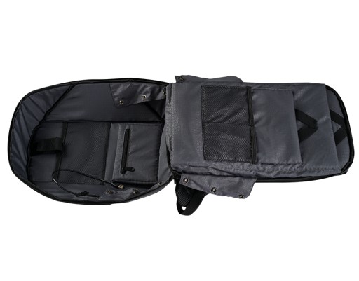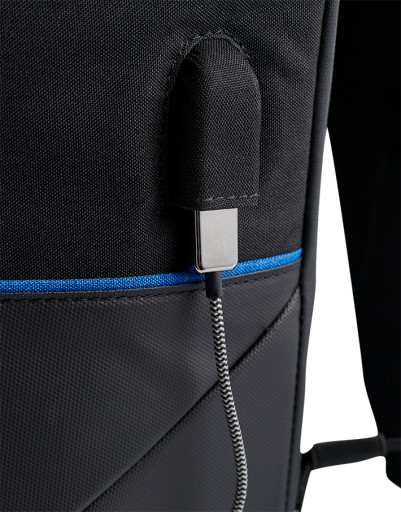 - Komora główna wyposażona w kieszenie z siatki, zapięcie do zestawu słuchawkowego i złącze USB