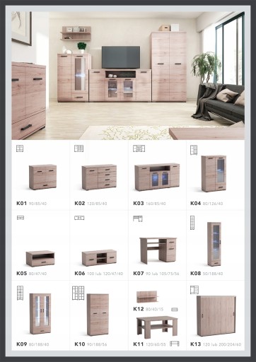 - Komoda K1: szerokość: 90 cm, głębokość: 40 cm, wysokość: 85 cm