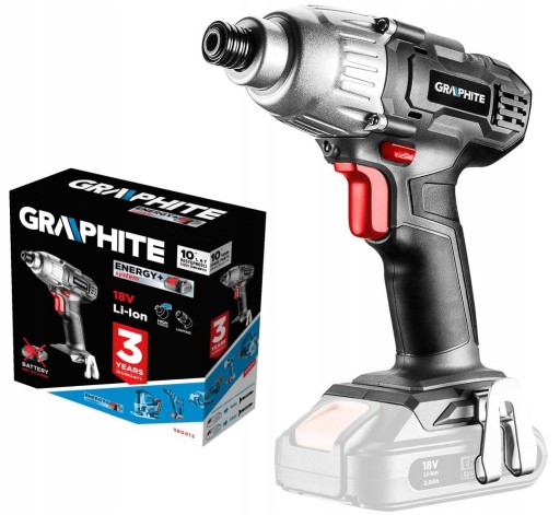 Zakrętarka GRAPHITE, współpracująca z akumulatorami 18V Li-Ion GRAPHITE Energy+. Urządzenie przeznaczone jest do wkręcania i wykręcania wkrętów i śrub w drewnie, metalu, tworzywach sztucznych. Pozwala ono na pracę z dużymi prędkościami (do 2200 obr./min) oraz zapewnia wysoki moment obrotowy (180 Nm). Moment obrotowy jest generowany w postaci chwilowego udaru obwodowego, więc oddziaływanie urządzenia na ręce operatora podczas wkręcania jest niewielkie. Uchwyt narzędziowy 6.35 mm (1/4") przystosowany jest do pracy z najbardziej popularnym typem końcówek wkrętakowych/bitów. Urządzenie wyposażono w elektryczny hamulec silnika pozwalający na szybkie zatrzymywanie wrzeciona oraz diodę LED, podświetlającą miejsce pracy. Ergonomiczny kształt uchwytu i zoptymalizowana długość całkowita zakrętarki pozwalają na efektywną pracę w każdych warunkach.